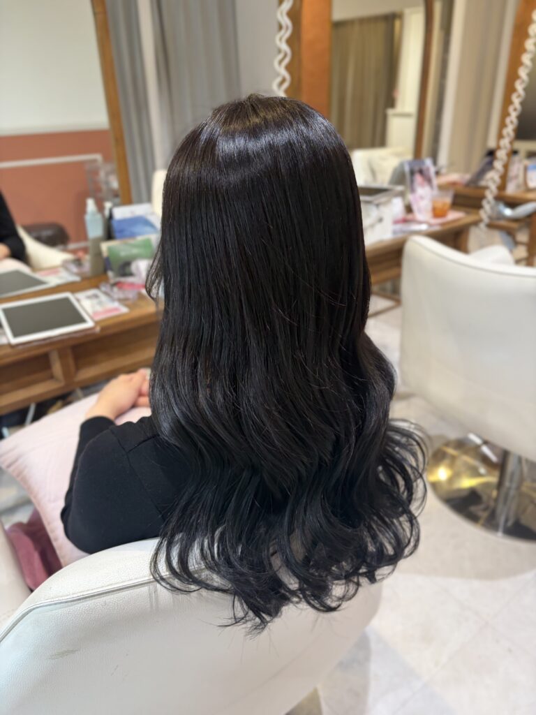 毎日のスタイリングで、髪がパサパサに見えたり、色がすぐ黄ばむのが気になりませんか? そのまま放っておくと、ツヤが消えて重たく見えたり、褪色して疲れた印象に見えてしまうことも…。 そこでおすすめが、透け感のあるブルーブラックカラー♪暗めでも重くならず、写真のようにツヤっとなめらかな質感に!肌も明るくきれいに見えます♪ 「暗髪なのに透明感があって嬉しい!」「ツヤが出て髪がきれいに見える!」とお客様からも好評です♪ 今ならクーポンでお得に試せます!ぜひご予約お待ちしています♪髪質改善/韓国/インナーカラー/ハイライト/レイヤーカット/白髪ぼかし/ブリーチ/ダブルカラー/ハイトーン/トリートメント/ヘッドスパ/藤井寺/土師ノ里/羽曳野/古市